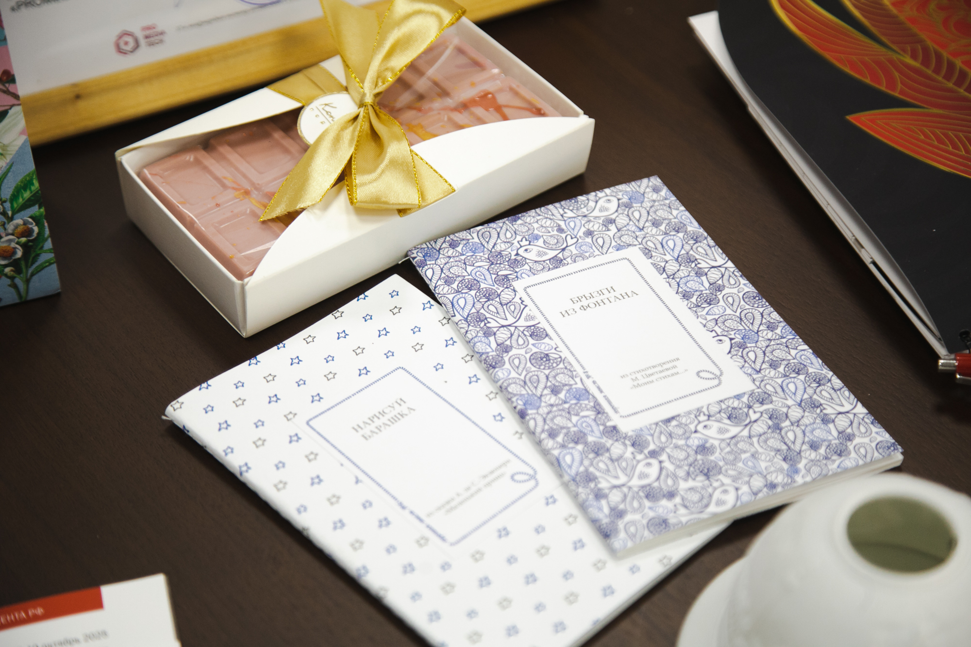 Упаковка: отдельные тетради можно одеть в картонную муфту с сургучом. Под кожаный блокнот со сменными тетрадями можно разработать футляр или коробочку.