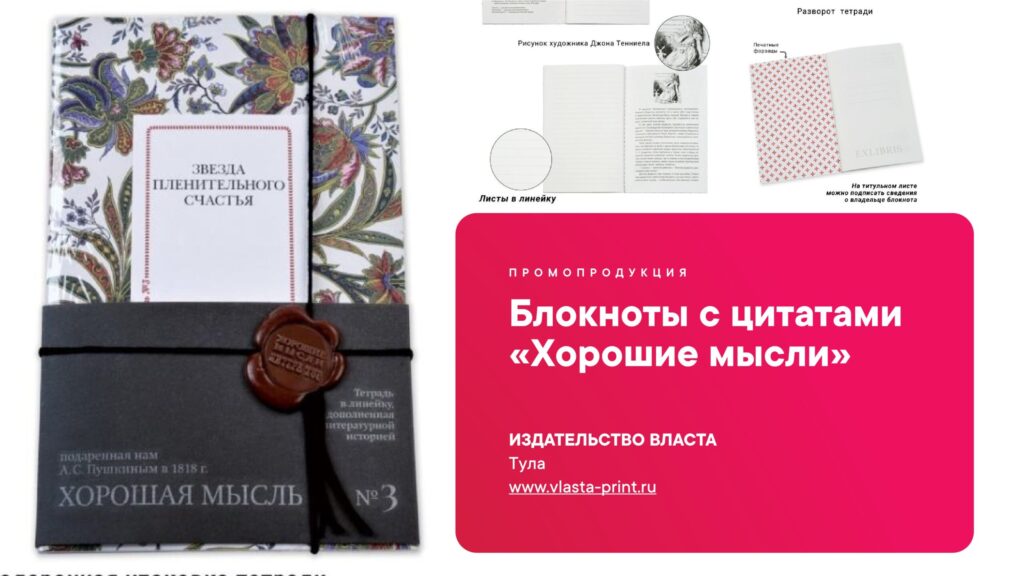 Коллекция небольших тетрадей с литературными цитатами — это третья группа блокнотов из проекта издательства «ЛитераТур». На обложке этикетка, на которой написано «Хорошая мысль № 1, 2, 3… и цитата из произведения. Внутри небольшая история, связанная с автором цитаты, либо его произведением. Пока таких блокнотов — 12.