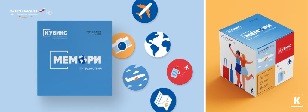 Варианты подарков для «Аэрофлота» в тематике полёта и путешествий. Развивающая игра Кубикс «Мемори»; смоляные стикеры — небольшой, но памятный сувенир; творческий набор «Брелок-раскраска»: деревянный брелок в виде самолёта, краски и кисточка.