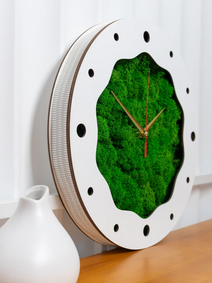 Необычные интерьерные часы для дома и офиса со стабилизированным мхом с чешским кварцевым механизмом ETA. Часы имеют тихий и плавный ход. В комплект входят пальчиковые батарейки и два вида стрелок: золотые и серебряные. Часы созданы в классической круглой форме из берёзовой фанеры, также представлены детские дизайны. Мох стабилизирован, поэтому полностью безопасен. Это популярный природный материал, часто используемый для декоративного оформления внутреннего пространства помещений. Стильный дизайн позволяет дополнить такими часами любой интерьер.