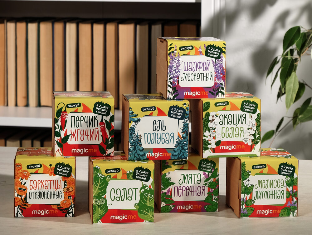 Экокуб – идеальный набор для выращивания растений: есть всё необходимое от семян и грунта до подробной инструкции по уходу за сеянцем. Сделан из натурального дерева, на этикетке – весёлая сказка вместо стандартного описания растения, что мотивирует собрать всю серию наборов для выращивания. Прилагается деревянный значок, который можно удобно прикрепить к кубу, чтобы не забыть, какое растение должно вырасти.