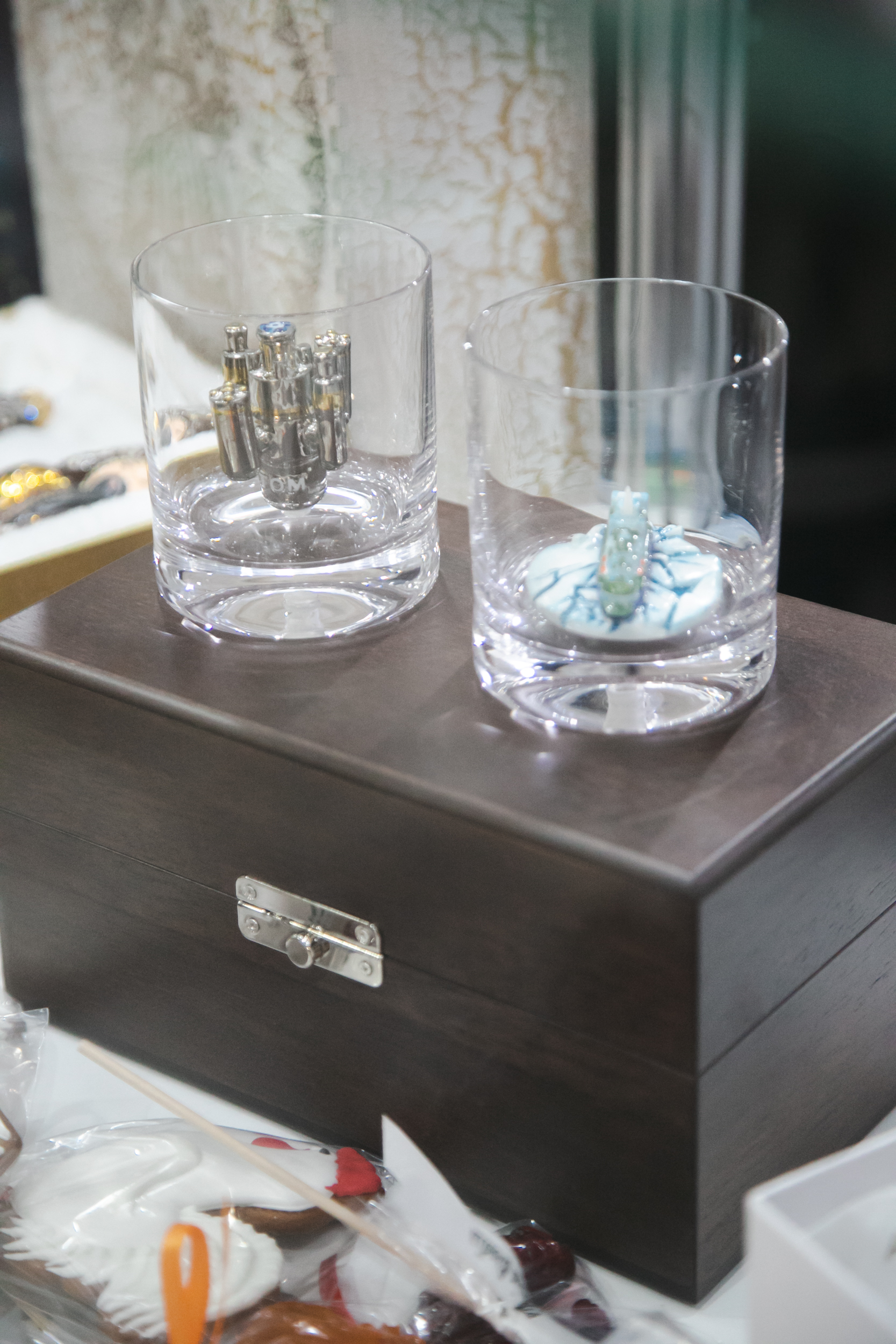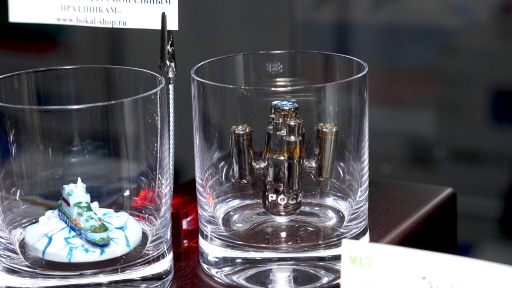 Бокал с фигуркой ядерного реактора и с логотипом «РОСАТОМ». Подобные реакторы установлены на ледоколах проекта 22220. Росатом развивает инфраструктуру Северного морского пути, как кратчайшего грузового маршрута между Северной Европой и Азией, что является одним из ключевых направлений деятельности госкорпорации.