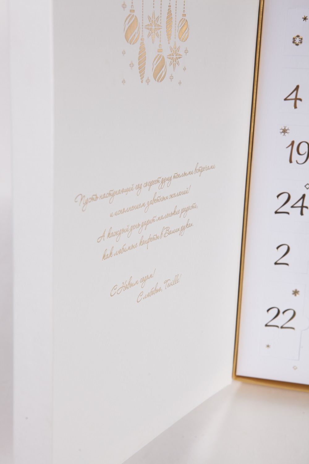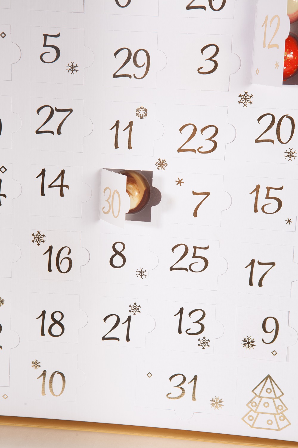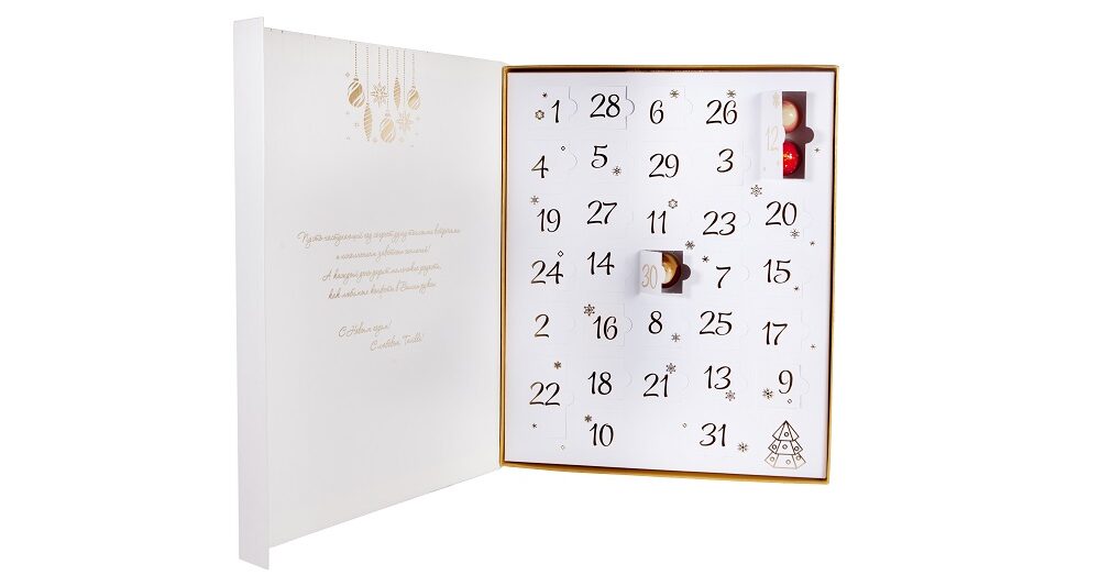 В изысканном новогоднем адвент-календаре «ТЕВИЛЬ», где спрятаны конфеты ручной работы с авторскими начинками из щвейцарского премиального шоколада Felchlin — 31 окошко.