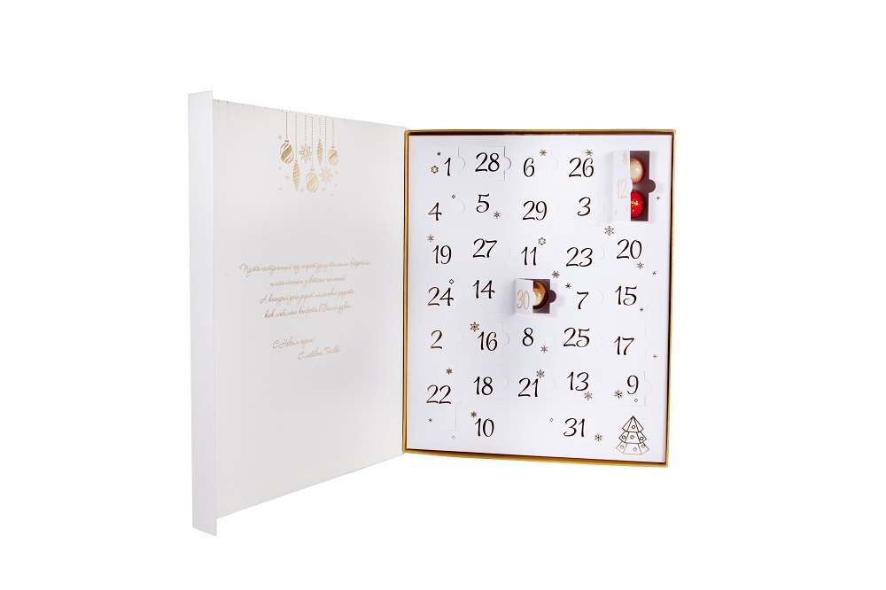 В изысканном новогоднем адвент-календаре «ТЕВИЛЬ», где спрятаны конфеты ручной работы с авторскими начинками из щвейцарского премиального шоколада Felchlin — 31 окошко.