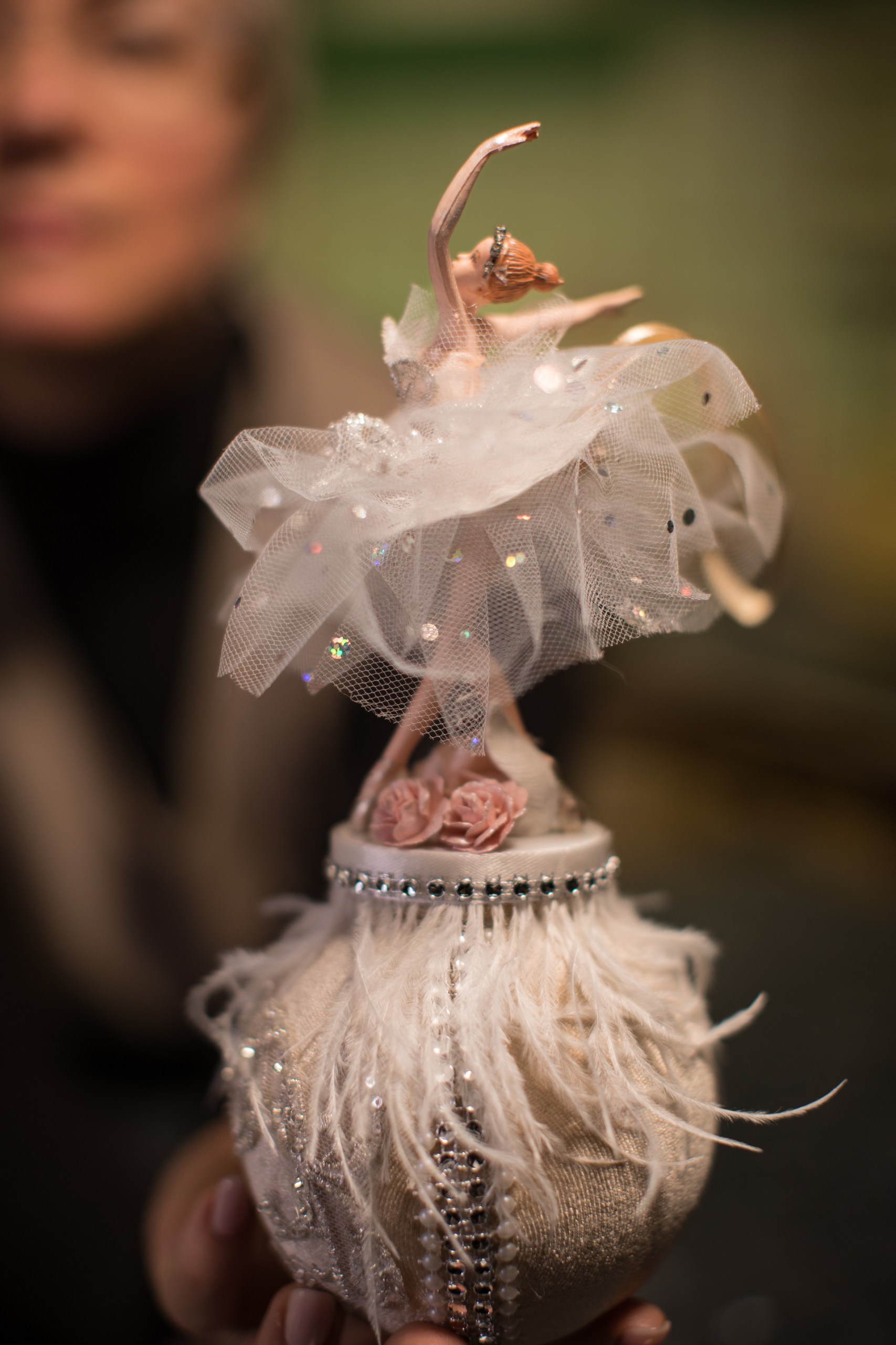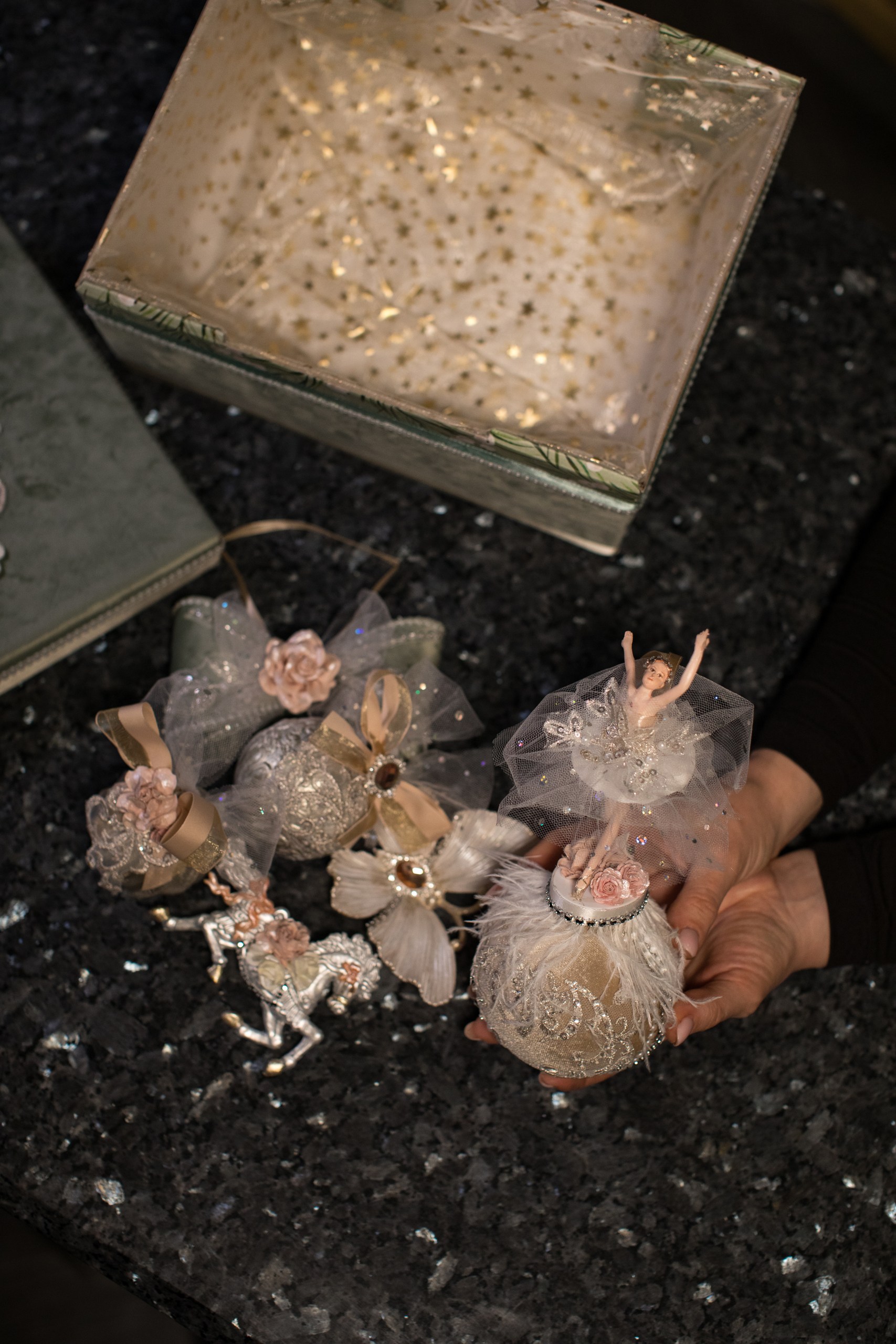 Набор новогодних игрушек ручной работы выполнен из премиальных материалов: бархат, органза, кружево, вышивка, перья, кристаллы, цветы, жемчужная тесьма, лепнина. В наборе сказочные персонажи: Щелкунчик, Балерина, ёлочные шары, верхушка на елку, банты, музыкальные инструменты, бабочка, лошадка и другие игрушки.