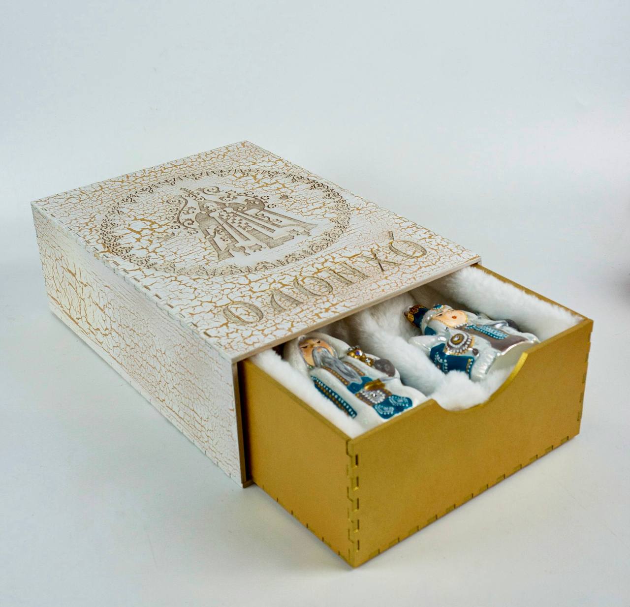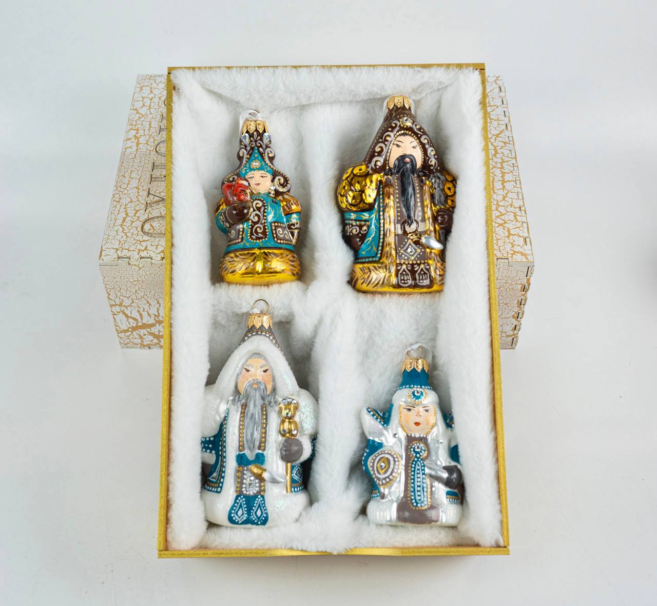 Внутри коробки игрушки бережно уложены на мягкий искусственный белый мех. Этот элемент не только обеспечивает надёжную защиту и роскошную презентацию, но и вызывает ассоциации со снежными просторами Якутии, добавляя теплоты и уюта.