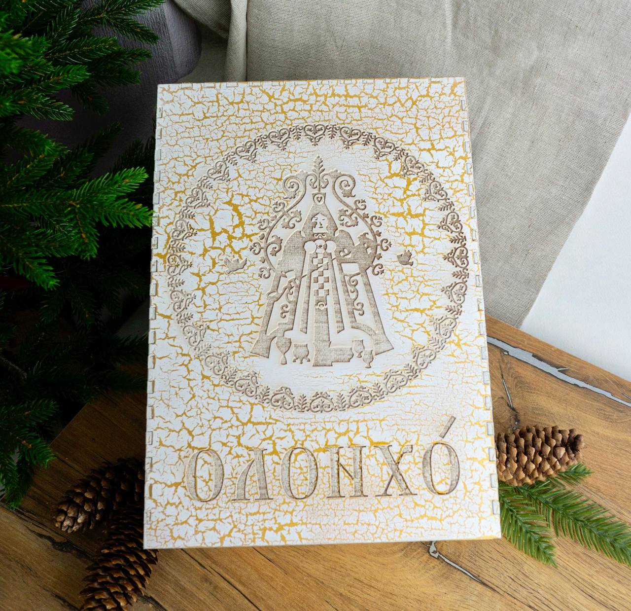 Сама коробка выполнена из фанеры, что подчёркивает натуральность и экологичность материалов. На поверхности выгравирован оригинальный орнамент, который вдохновлён традиционными якутскими узорами. Надпись «Олонхо» выполнена изящным шрифтом, подчёркивающим связь с культурной идентичностью региона.
