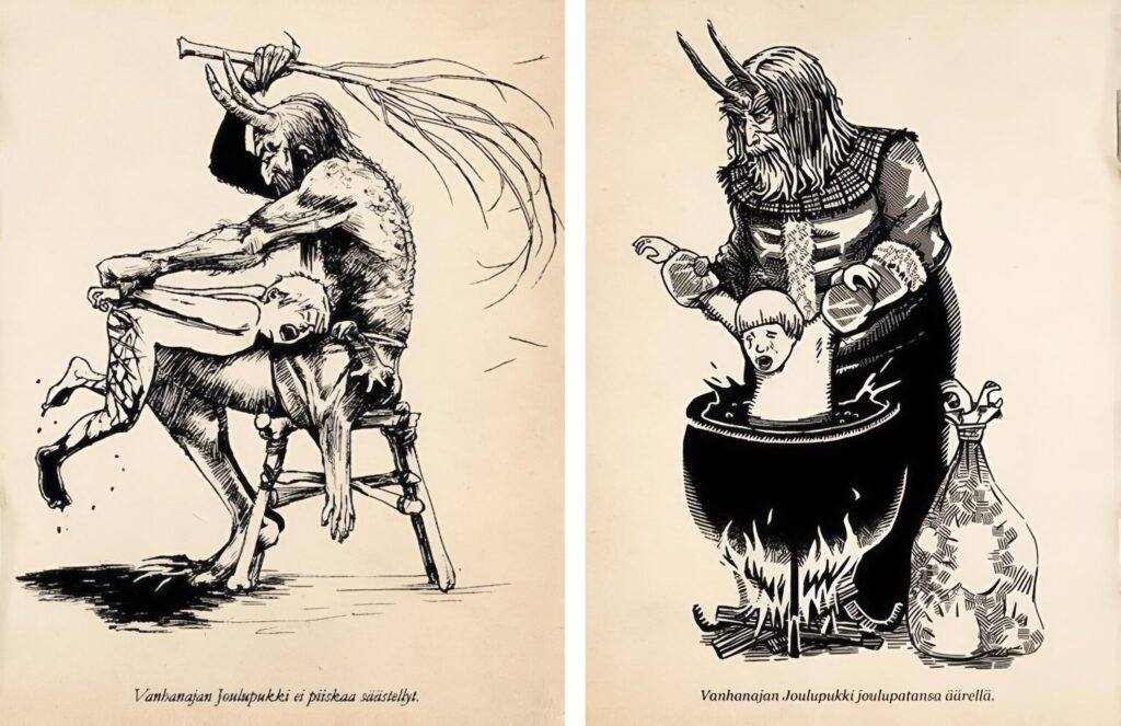 «Скандинавские Святки называются Йол или Юл (Jol, Jul), от них слово перешло и к финнам, которые называют это время Йоулу (Joulu). Общим у скандинавов, финнов и русских является также то, что подарки в это время приносит не Святой Николай, как это происходит в большинстве стран Европы, а другой персонаж, никак с Николаем-Угодником не связанный. В России — это Дед Мороз, сравнительно новое действующее лицо, а в Финляндии Йоулупукки (Joulupukki). Первая часть слова уже знакома и означает святочное время, а вторая означает «козёл». Его и изображали ещё сто лет назад в виде козла. И был он совсем не добрым старичком, и подарки дарил далеко не всем детям. Финские дети ещё моего поколения, этого персонажа больше боялись, чем ждали, так как он, приходя, выяснял сначала, был ли ребёнок послушным в течение года, и только потом решал, получил ли он подарок или розги.