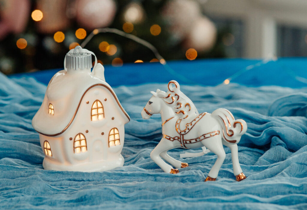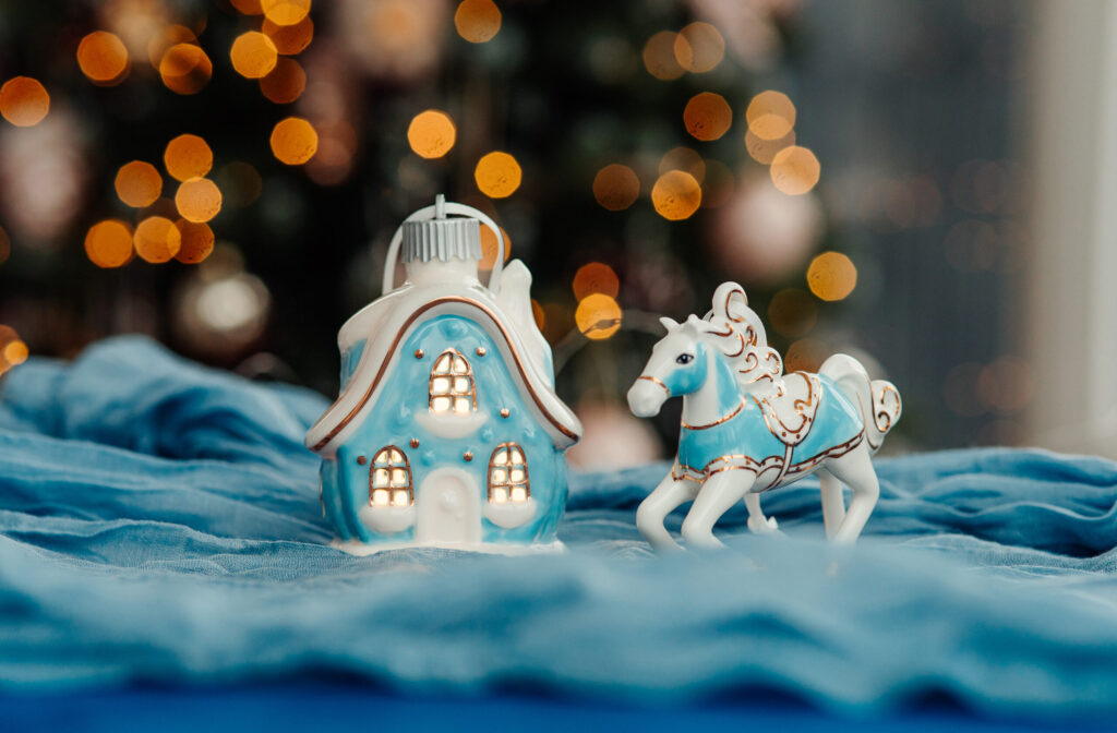 Это не просто ёлочные украшения, а воспоминание, которое останется с вами, ведь в этом фарфоровом дуэте — всё очарование семейных праздников. Тёплый свет в окнах домика и лошадка, будто сошедшая с рождественской иллюстрации, переносят в сказку.