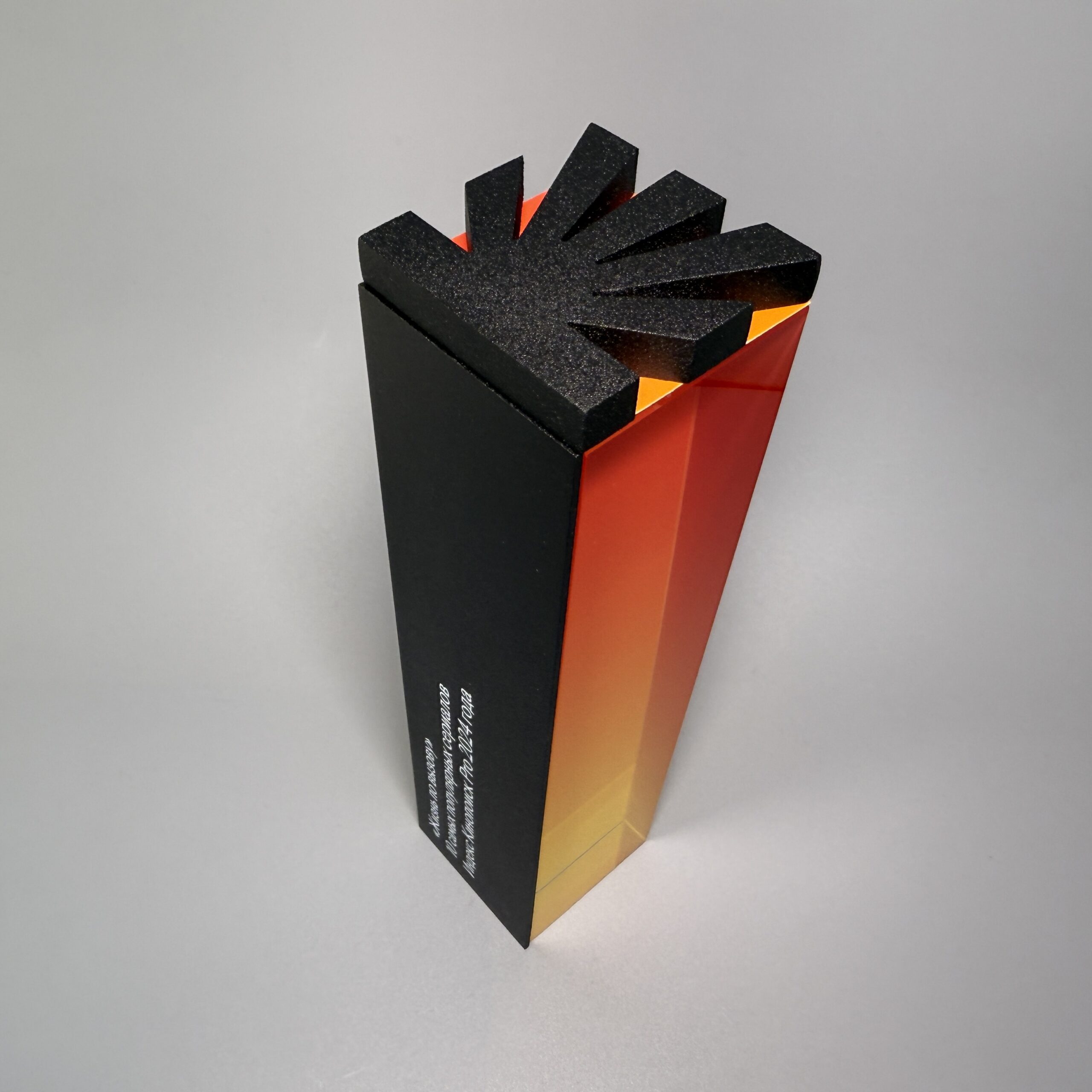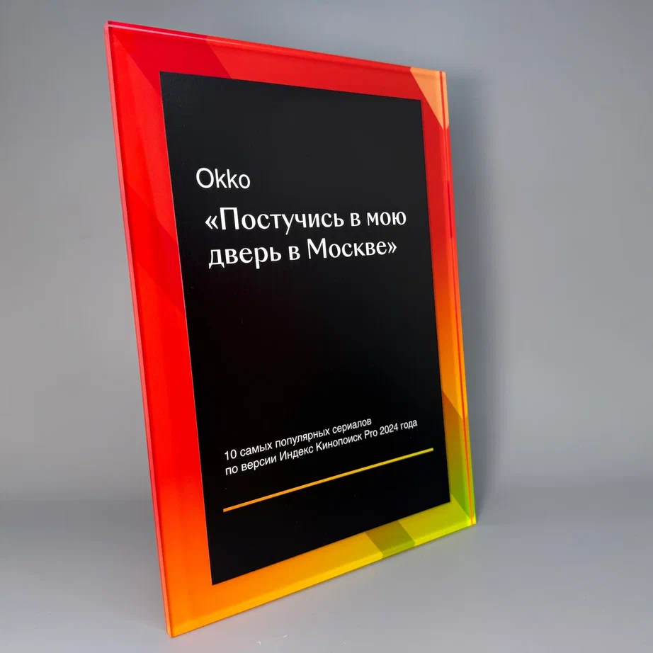 Набор объединяет 2 изделия с визуальной и концептуальной привязкой к бренду «Окко» и «Кинопоиск». Плакетка из органического стекла толщиной 8 мм и металла толщиной 2 мм. Стела из стекла марки К9 и металла толщиной 2 и 10 мм, с нанесением УФ-печати на изделия, выполнены в современном, технологичном и эстетичном стиле.