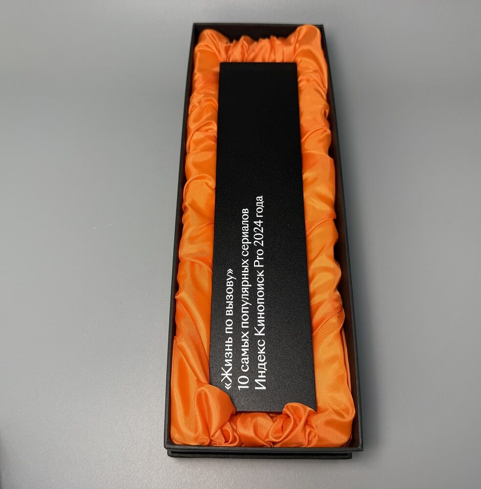 Персонализация: можно разместить логотип «Окко», «Кинопоиск», имя лауреата, дату события, цитату из фильма или короткое поздравление. Металлические элементы могут быть любого цвета.