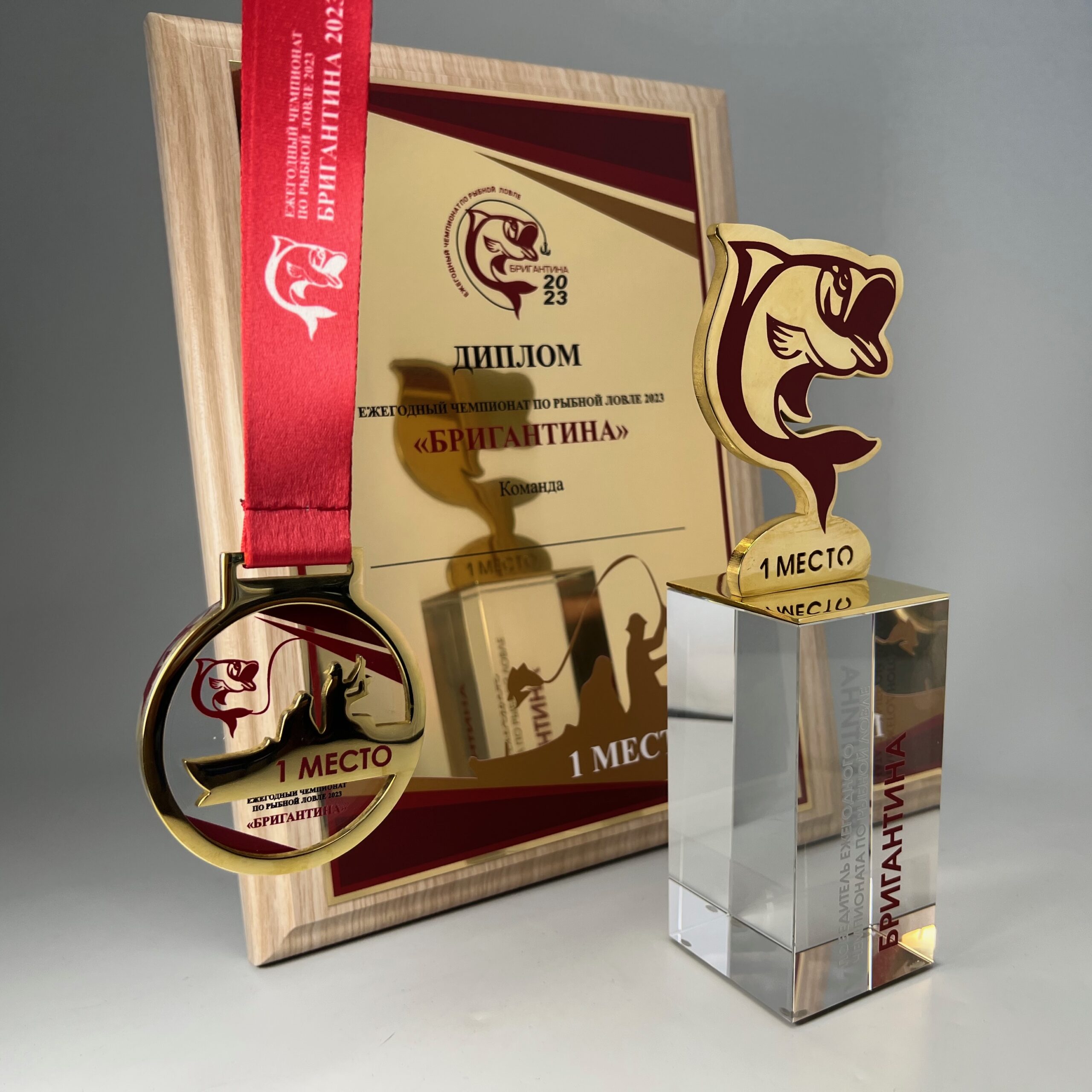 Эксклюзивный наградной набор по спортивному рыболовству включает кубок, плакетку и медали, выполненные из стекла и латуни. Функциональность, эстетика и символика отражают дух состязательности, уважения к природе и мастерства рыбака.