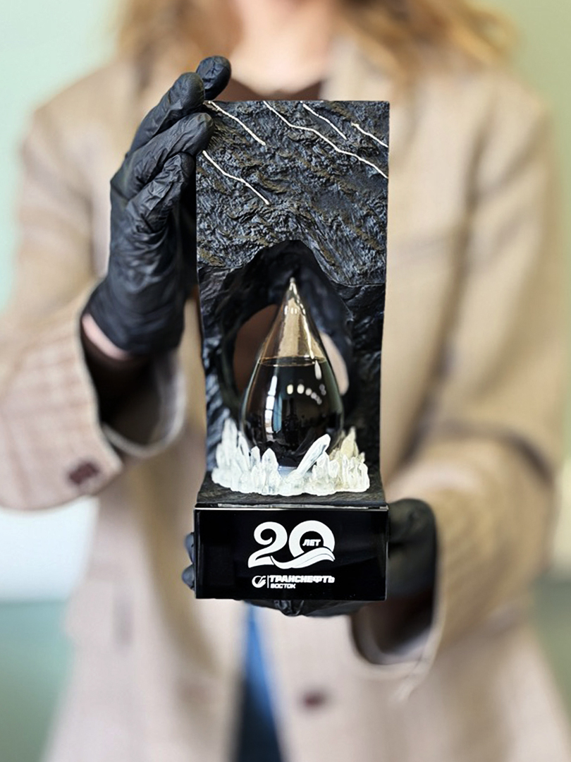 Создатели награды не стали имитировать нефть — они взяли оригинал и влили его в стеклянную колбу, выдутую вручную. Так внутри награды оказалась частичка реального сырья, добытого в суровых условиях.