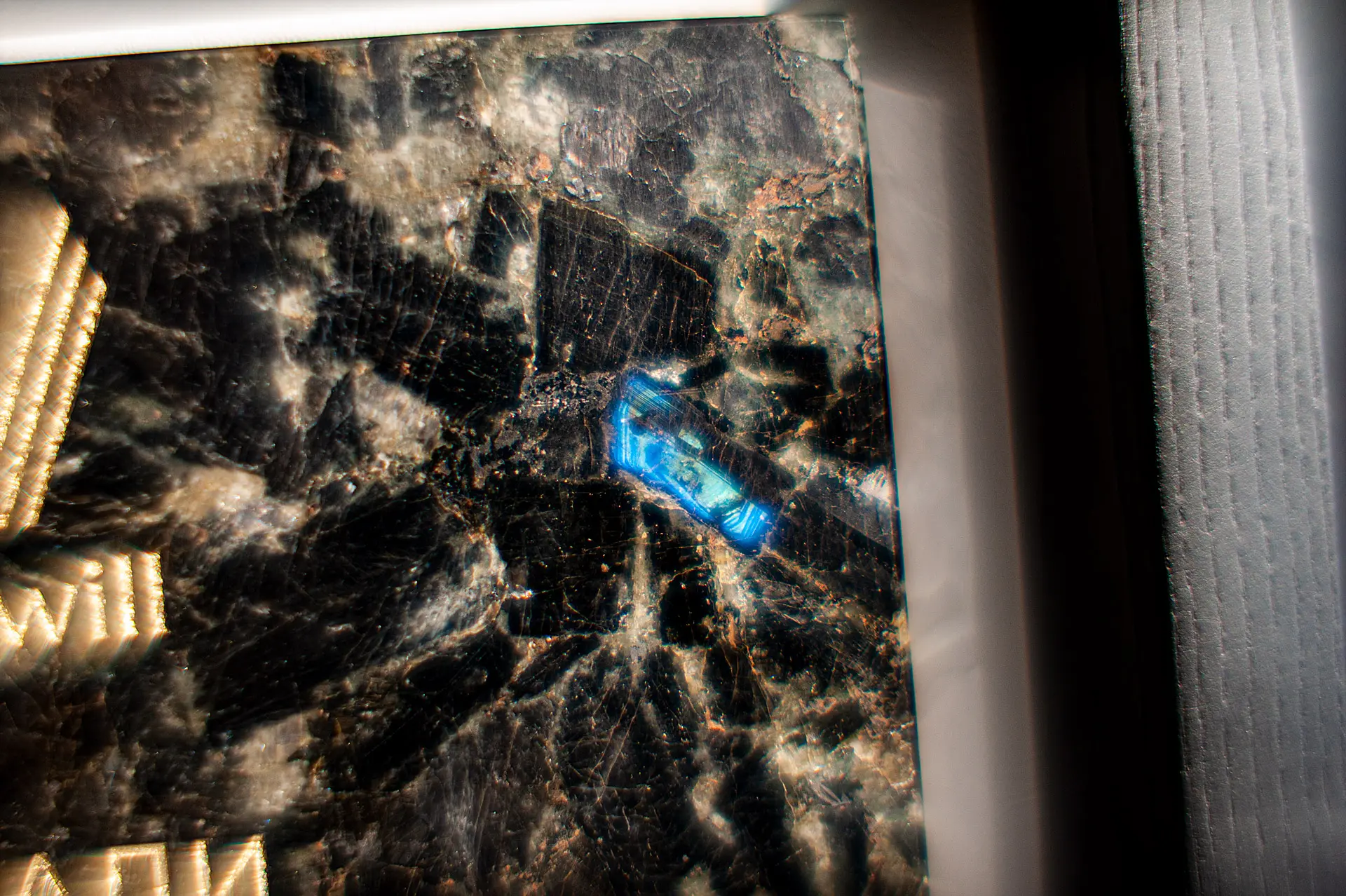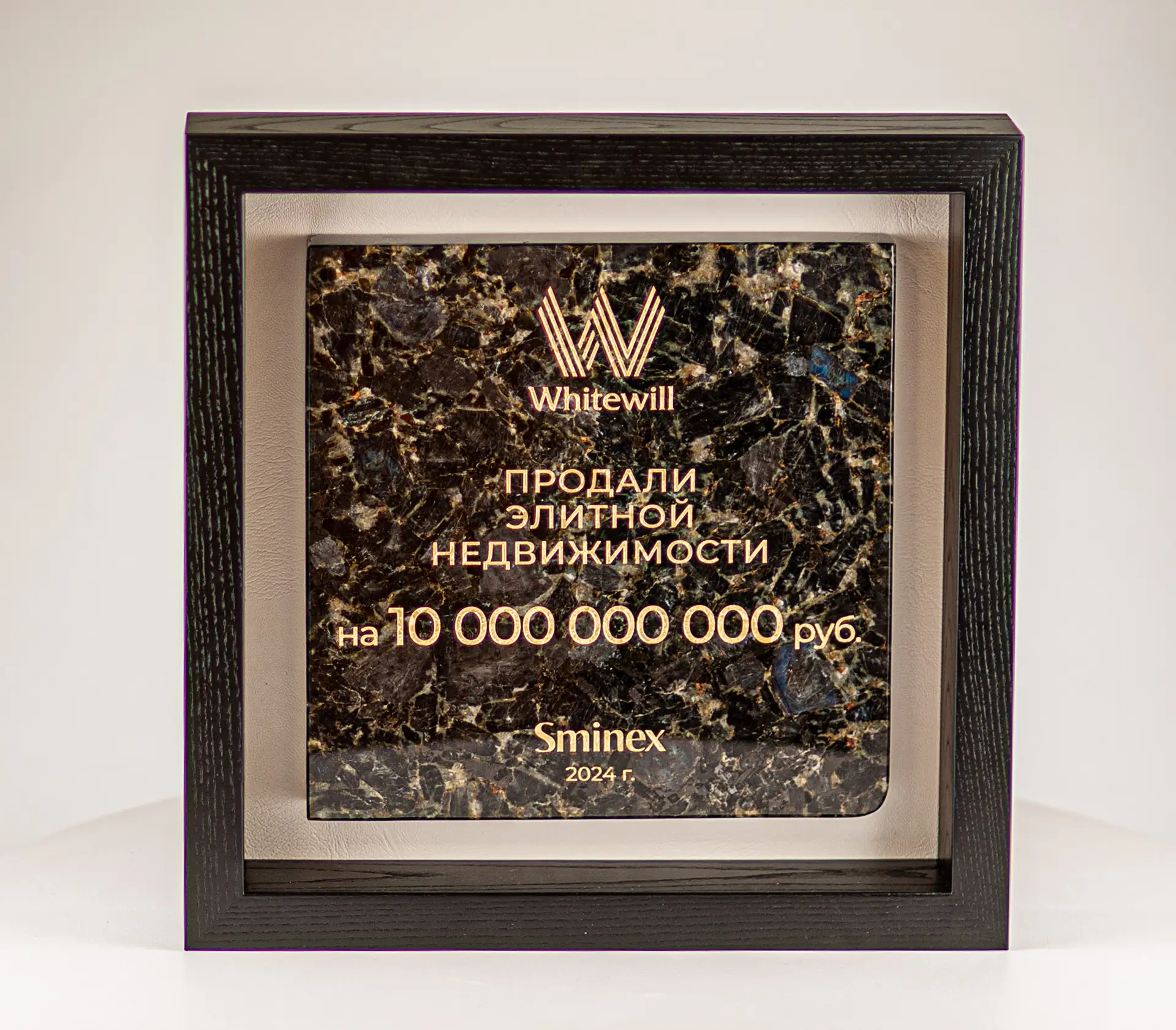 Подарочная плакетка из натурального камня лабрадорита оформлена в деревянной раме с лаковым покрытием и накладкой из натуральной кожи. Представлена в подарочном шпонированном кейсе с перчатками для бережного вручения. Индивидуальная форма каменной пластины, ручная полировка, гравировка логотипа и покраска текста под золото — изделие было создано с нуля.
