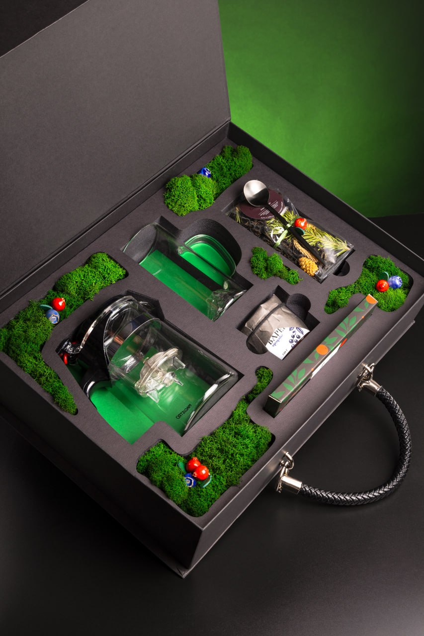 Упаковка скорее напоминает небольшой чемодан (дипломат). Ложемент украшен натуральным стабилизированным мхом и керамическими ягодками ручной работы. Все вместе создаёт ощущение настоящего природного ландшафта в коробке.