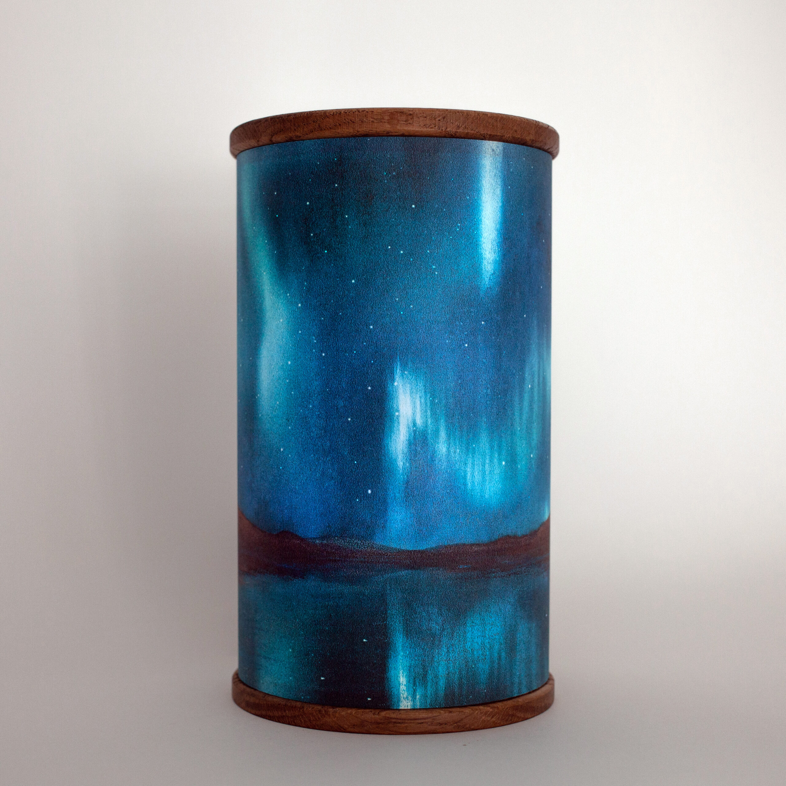 Цилиндрическая форма светильника создаёт ощущение цельного объекта, в котором свет становится полноправной частью художественной композиции. Внутри размещена светодиодная лента, управляемая микроконтроллером Arduino. Алгоритм переливов основан не на зацикленном сценарии, а на вероятностной генерации оттенков, благодаря чему рисунок на абажуре как будто «оживает» каждый раз по-новому. Этот эффект нельзя предсказать или повторить — свет становится живым элементом, создающим спокойную, созерцательную атмосферу.