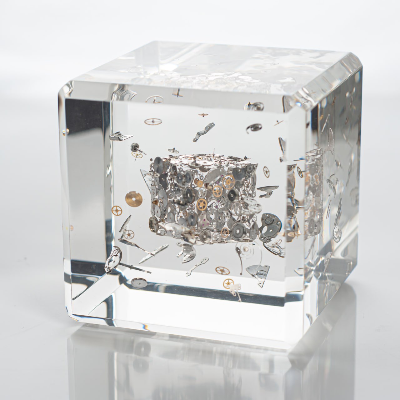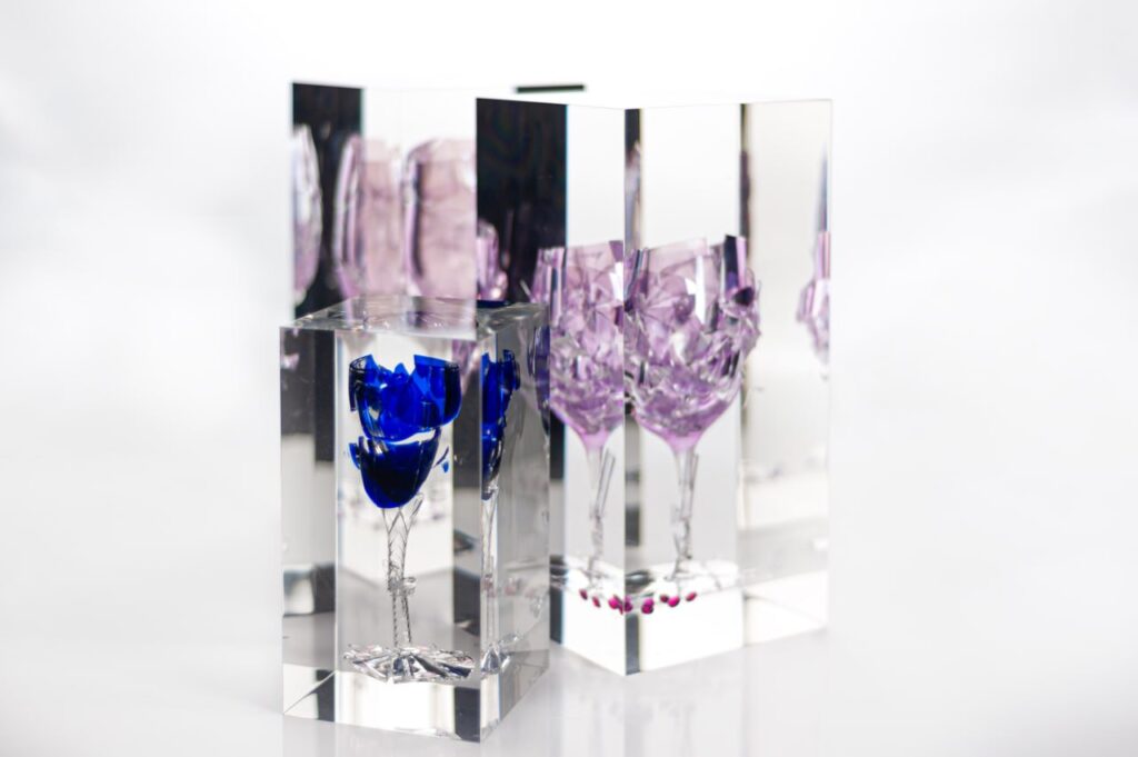 Изначально эксперименты начались с заливок в смолу. Этот материал открывал новые возможности и позволял пробовать самые разные форматы, но со временем стало понятно, что у смолы есть серьёзные ограничения. Она недостаточно прозрачна, подвержена пожелтению, а внутри часто остаются слои и завихрения. Для премиального уровня качества, к которому стремились, этого было недостаточно.