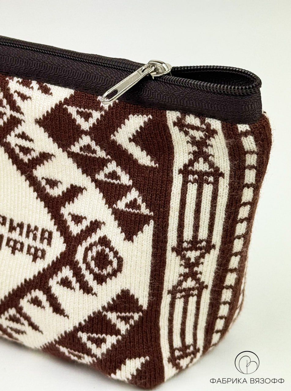 Косметичка компании «Вязофф» выполнена в светлых бежевых оттенках с эмблемой контрастного цвета. Внешний слой связан жаккардовым переплетением, внутренний слой изготовлен из влагостойкой ткани. Предназначена для хранения небольших предметов, ключей, косметики, ювелирных украшений.