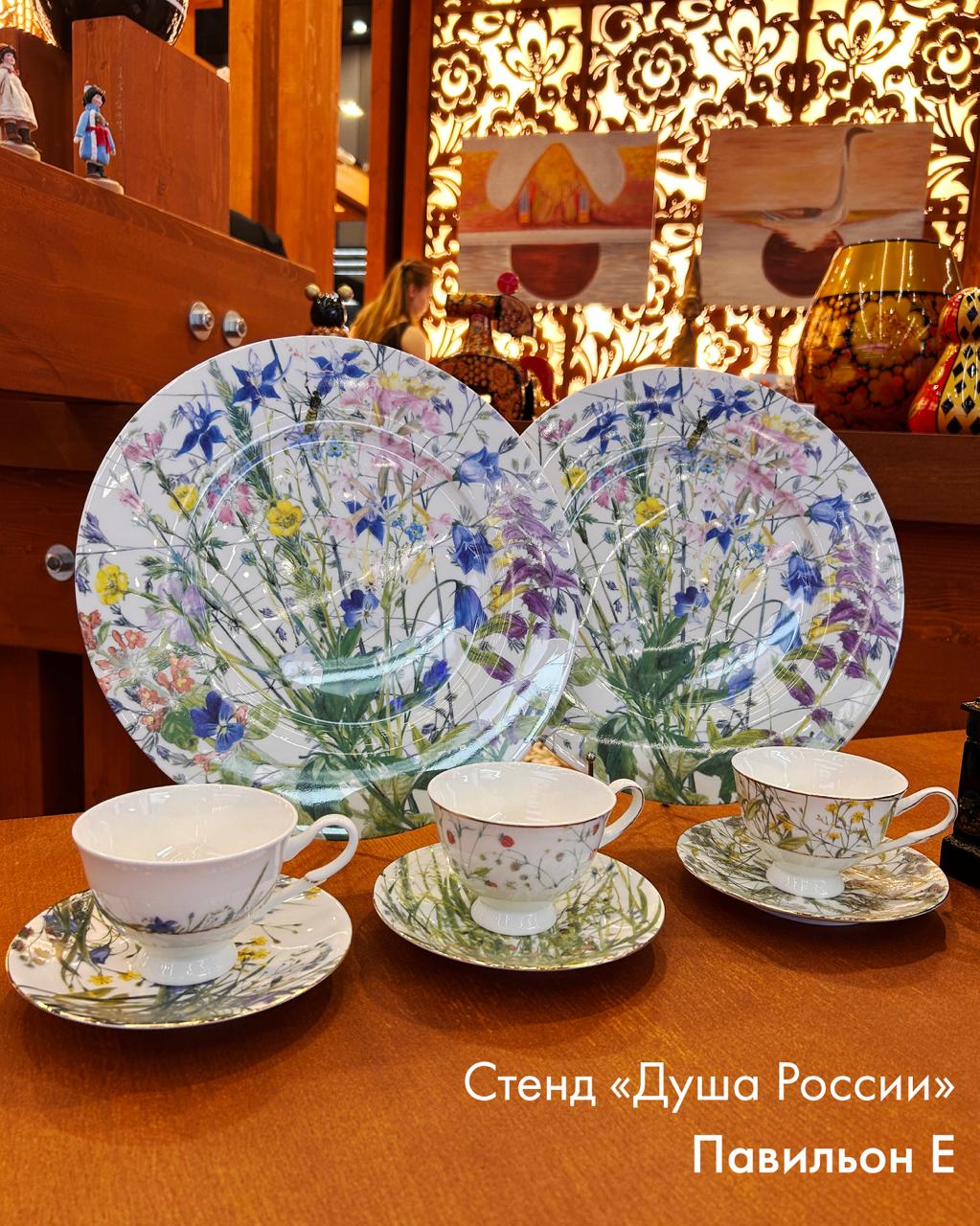 - На стенде «Душа России». Особое место здесь занимает коллекция «Ясная Поляна», созданная в соавторстве с Модным Домом Татьяны Парфёновой. Живописные тарелки и чайные пары отсылают к духу русской усадьбы, где как будто расцвело лето — тёплое, щедрое, с ароматом скошенной травы и полевых цветов.