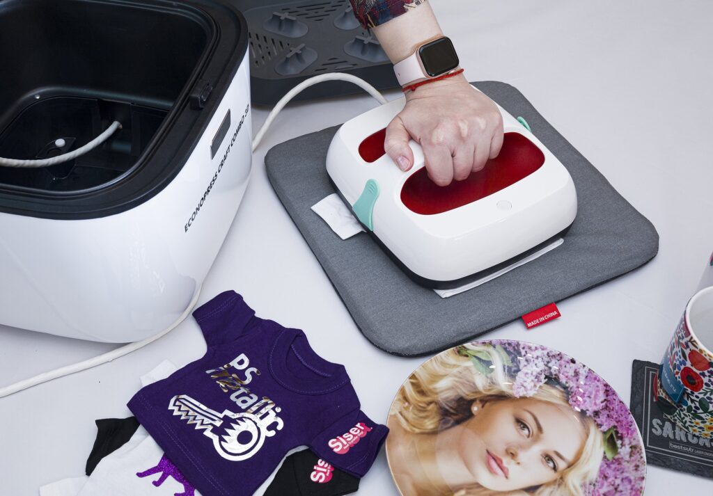 Это универсальное оборудование для переноса на различные предметы. С его помощью можно декорировать текстиль, кружки, фляжки, тарелки, камни. Помимо вакуумной камеры для запечатывания неровных заготовок, в комплект входит плоский пресс, похожий на ECONOPRESS CRAFT. В комплекте — насадки для вакуумного переноса, жаропрочная подставка, коврик, перчатки.