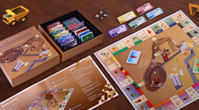 Сувенир с уникальной идеей и индивидуальным дизайном разработан и произведён для золотодобывающей компании. Подарочная коробка оригинальной настольной игры «Золотой запас» по мотивам «Монополии» украшена тиснением золотой фольгой и выборочным УФ-лаком. Визуально подарок получился очень современным благодаря дизайну с векторной графикой.