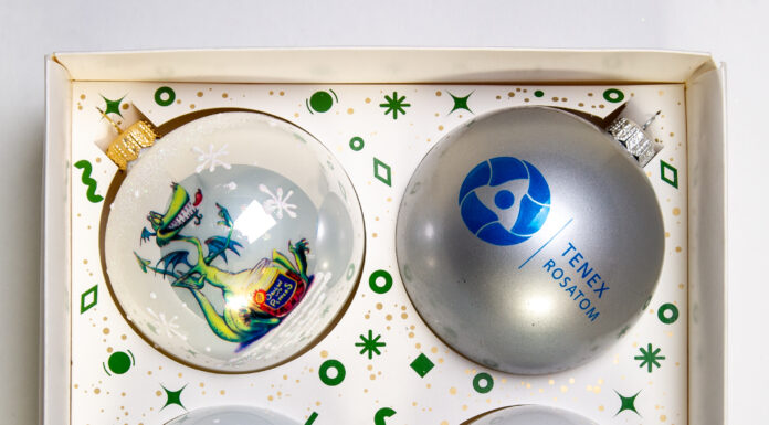 В наборе четыре стеклянных шара: два с символом Нового года – Драконом, и два с логотипами компаний.