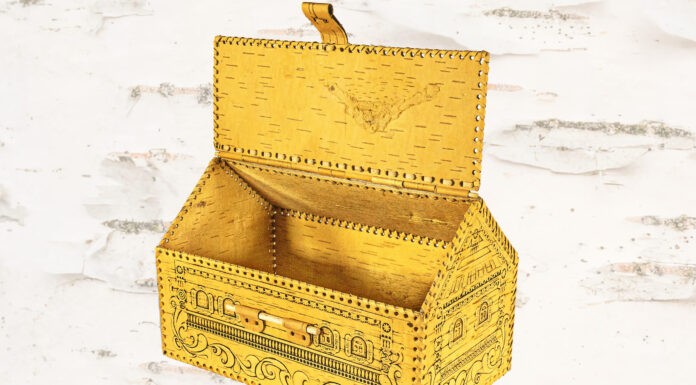 Домик – эксклюзивная ручная работа. Покатая крыша – это крышка берестяного короба, состоящая из двух половинок, которая открывается простым поднятием. Петли усилены дополнительно специальными материалами, что позволяет выдерживать вес до 10 кг, ручка удобная и приятная на ощупь. Тиснение.