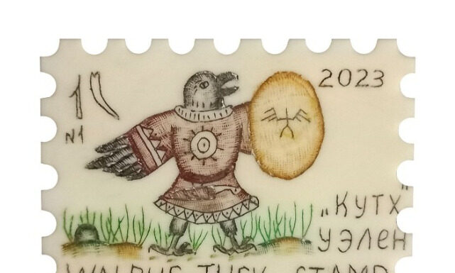 Марка-виньетка из бивня моржа (WALRUS TUSK STAMP) разработана и выполнена на Чукотке, в производственном цеху «Уэленская косторезная мастерская» с участием мастеров-косторезов.