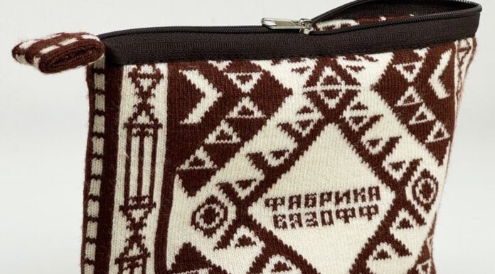 Косметичка компании «Вязофф» выполнена в светлых бежевых оттенках с эмблемой контрастного цвета. Внешний слой связан жаккардовым переплетением, внутренний слой изготовлен из влагостойкой ткани. Предназначена для хранения небольших предметов, ключей, косметики, ювелирных украшений.