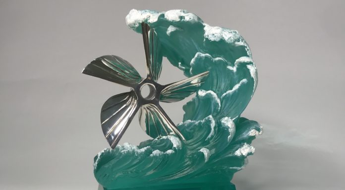 Статуэтка изготовлена для Федерации водно-моторного спорта России из полимерной смолы высокой чистоты и прозрачности с добавлением пигмента. Элемент винта выполнен из латуни с серебрением.
