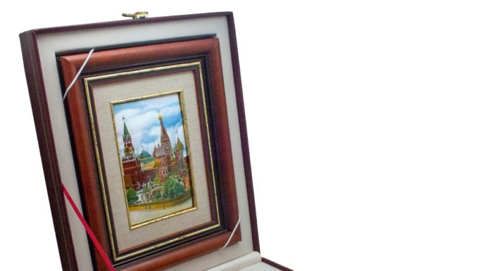 Панно с видом московского кремля в технике финифти и горячей эмали. Ручная роспись. Панно оформлено в багет, выполненный из дерева.