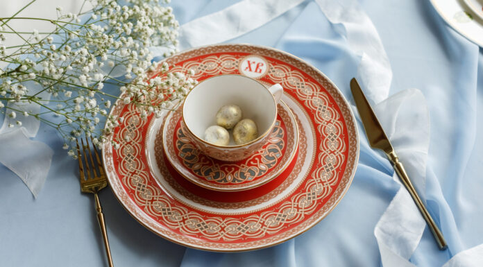 Ювелирные мотивы знаменитых яиц Фаберже на белоснежном фарфоре — словнолегкие сверкающие подвески на тонкой золотой цепочке, окаймляющие края изделий.