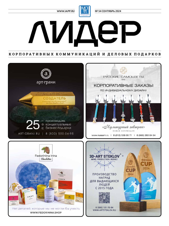 «ЛИДЕР корпоративных коммуникаций и деловых подарков» – 2024. – № 54 – С. 14-25. Экспонаты соискателей Премии опубликованы в журнале о корпоративных и креативных подарках — это периодическое отраслевое печатное издание Ассоциации МАПП о поставщиках и производителях сувенирной продукции.